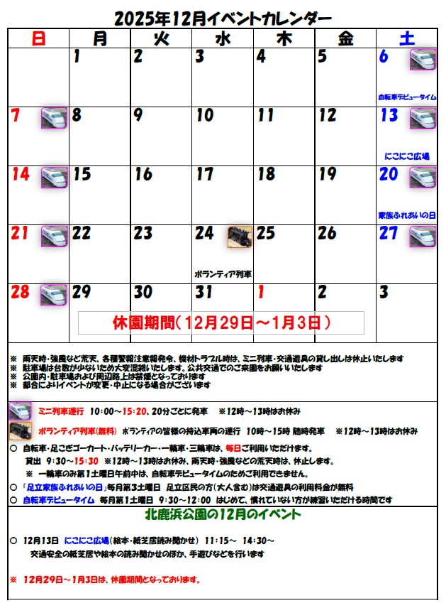 2025-12月北鹿浜公園イベントカレンダー2025年11月30日更新
