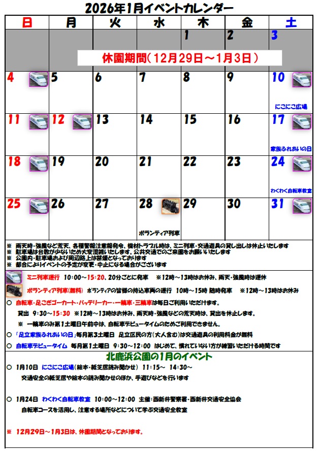 2026-1月北鹿浜公園イベントカレンダー2025年12月28日更新