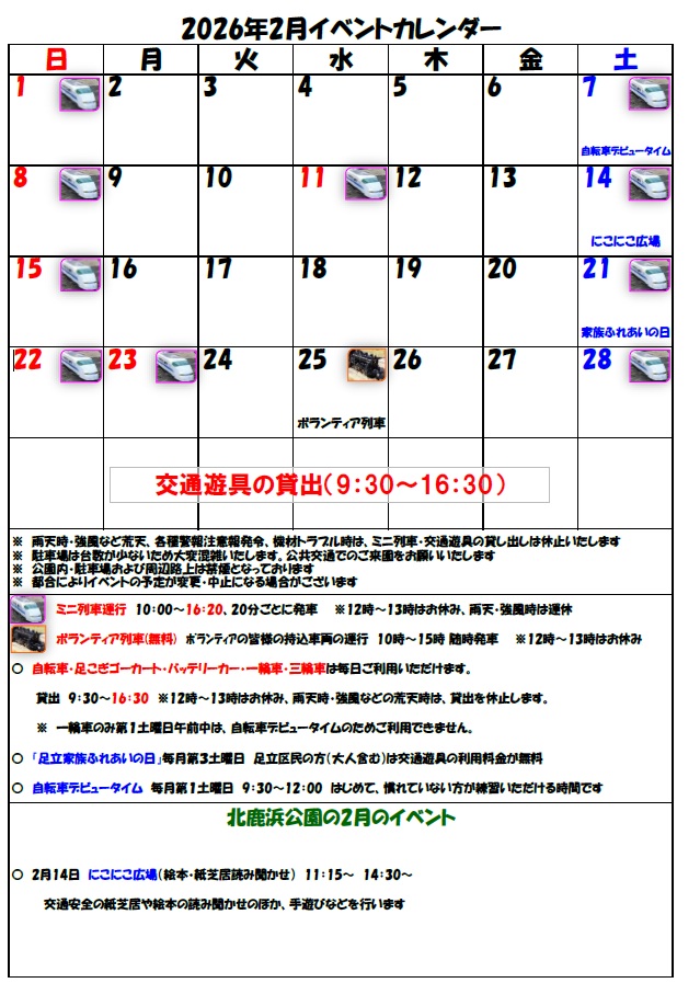 2026-2月北鹿浜公園イベントカレンダー2026年01月31日更新